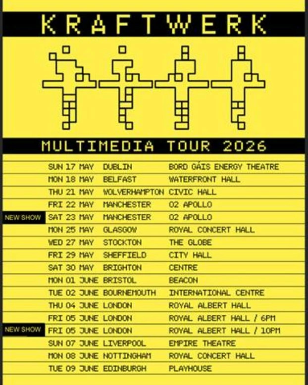 13 Oct 2025Kraftwerk ha añadido dos espectáculos en el Reino Unido a su gira Multimedia 2026 debido a una "demanda excepcional", menos de una semana después de que las entradas para la serie de espectáculos estuvieran disponibles por primera vez.