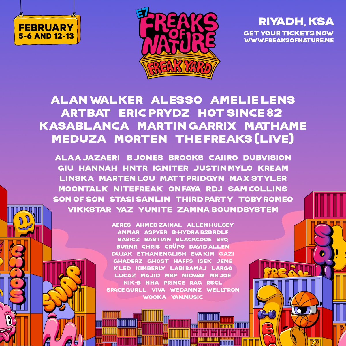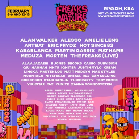 Freaks of Nature 2026 se celebrará los días 5, 6, 12 y 13 de febrero de 2026 en Riad. Las entradas ya están a la venta. Con el cartel completo ya revelado, los asistentes pueden asegurar su lugar en el Freakyard y unirse a la creciente familia Freak.