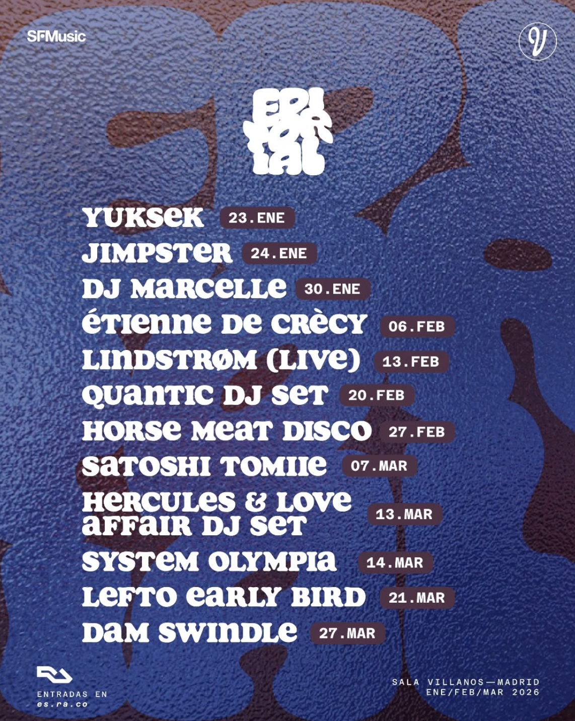 Sala Villanos ha desvelado su programación para los primeros tres meses de 2026, y la escena electrónica de Madrid ya está en ebullición. Entre los artistas confirmados se encuentran nombres de renombre como Lefto Early Bird, DJ Marcelle, System Olympia, Lindstrøm, Horse Meat Disco, Jimpster, Satoshi Tomiie, Hercules & Love Affair y Yuksek, quienes se encargarán de llevar la mejor música electrónica a la sala.