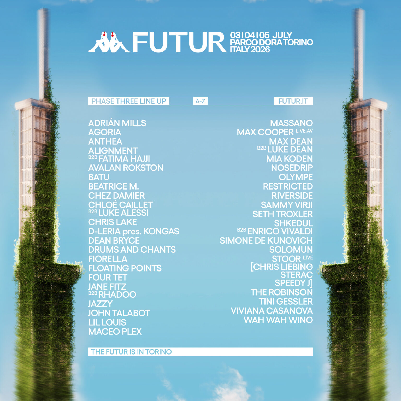 Completan este último avance artistas que debutarán en Parco Dora, como la DJ británica Anthea, la formación AVALAN ROKSTON, Batu, DJ y productor de Bristol creador del sello Timedance, la francesa Beatrice M, el DJ y productor londinense Dean Bryce o Chez Damier, aka del productor estadounidense Anthony Pearsons. Otros nombres que también serán protagonistas son Chris Lake, creador de hits como ‘Changes’, el sonido trancero de D-Leria con su show especial Kongas, el sonido underground de Drums and Chants, junto a artistas como Fiorella, Jazzy, Lil Louis, Massano, Mia Koden, Nosedrip, Olympe, Restricted, Riverside, Sammy Virji, Simone de Kunovich, The Robinson o Wah Wah Wino, conformando el line up más completo de Kappa FuturFestival hasta la fecha.