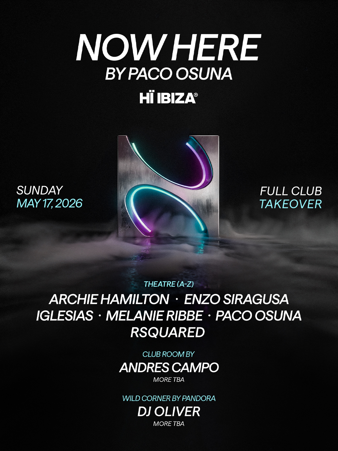 El icónico NOW HERE de Paco Osuna dará inicio a la temporada 2026 programando las tres salas del mejor club del mundo, Hï Ibiza, el domingo 17 de mayo, con Andres Campo al frente del Club Room y Pandora de DJ Oliver en el Wild Corner.